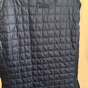 Navy quilted jacket by Patagonia. Features a full zip and high collar. Does have a company name on the back but it’s not super noticeable