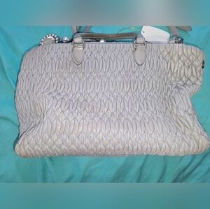 This rare limited edition Miu Miu satchel in a sophisticated gray hue features a distinctive quilted design that adds a touch of elegance to any ensemble. The structured handles and jeweled chain strap detail offer versatility and style, making it a perfect accessory for both casual and formal occasions. Its dome-like shape and textured material provide a modern and chic look.