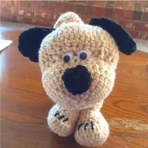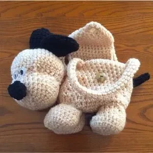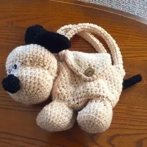 Charming crochet puppy dog purse toy. Soft and cuddly. Ideal for kids' playtime.