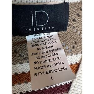 Cozy long knit cardigan by Identity. Features a mixed stripe and diamond pattern in cream, brown, tan, and olive tones. Open front design with ribbed trim and full-length sleeves. Soft and comfortable medium-weight acrylic blend.