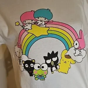 Charming Hello Kitty t-shirt. Features colorful rainbow and characters.