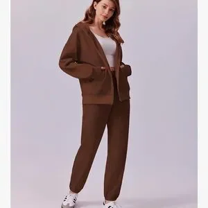 Stay cozy and stylish with this brown hoodie and pants set. Perfect for casual outings or lounging at home.