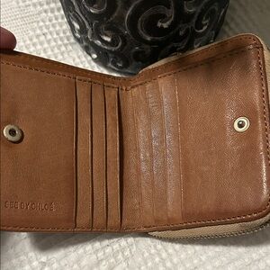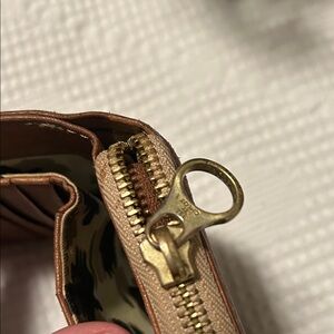 Stylish tan wallet. Features gold bow detail. Compact and elegant design.