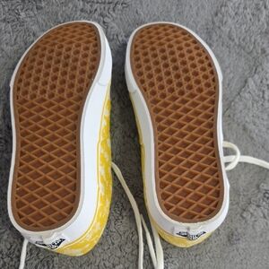 Vibrant yellow Vans with white floral design. Features white laces and soles.