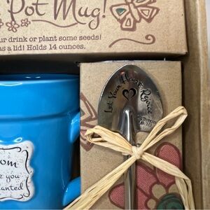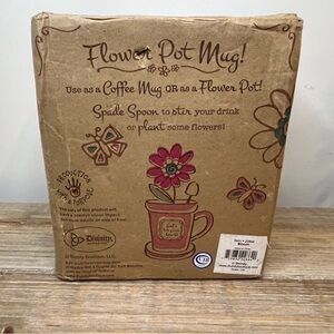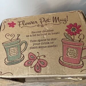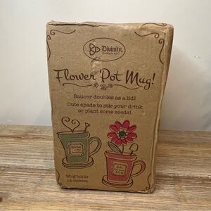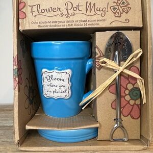 The ceramic mug is shaped like a terra cotta pot and features the uplifting message, "Bloom where you are planted." The included saucer can double as a lid to keep your drink warm.