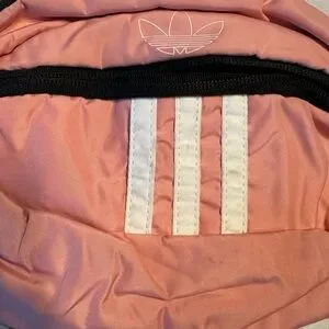 Stylish pink waist bag with a black strap. Features a front zipper pocket. Measurements in photos. Has some light dirt marks on the front; priced accordingly
