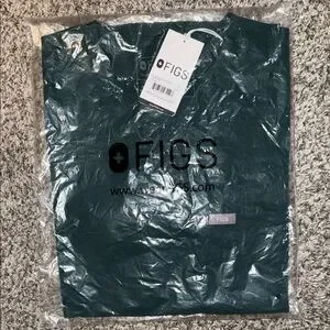 Stylish Figs scrub top in hunter green. Ideal for healthcare settings.