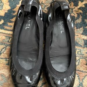 Sleek CHANEL flats in glossy black. Perfect blend of style and comfort.