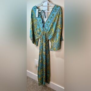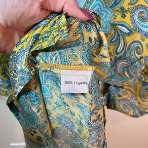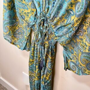 Step out in style with this elegant paisley maxi dress. Featuring a vibrant mix of blue and yellow, this dress is perfect for any occasion. The flowing design and intricate pattern make it a standout piece in your wardrobe.