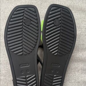 Sleek black flip flops by CROCS. Features adjustable straps for comfort. Ideal for everyday wear.