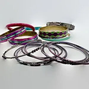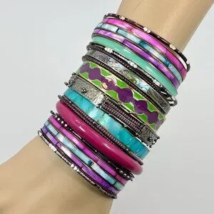Boho Bangle Bracelet Stack: Vintage India Enamel & Shell Set (17pc)
