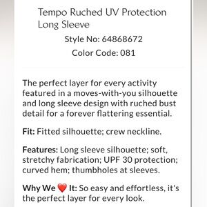 Features: Long sleeve silhouette; soft, stretchy fabrication; UPF 30 protection; curved hem; thumbholes at sleeves.