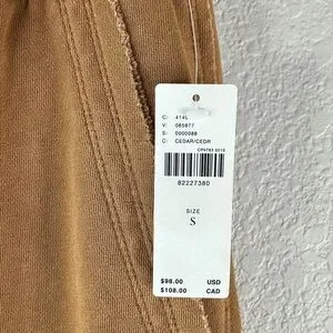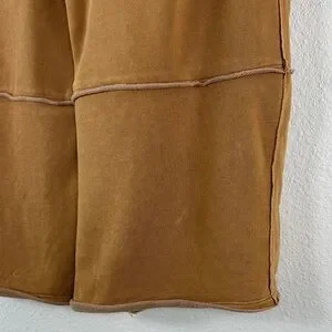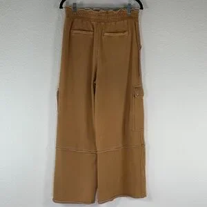 Elevate your style with these chic wide leg tan cargo pants. French terry, snap closure, elastic waistband, rolled hem. Back right bottom leg has some slight variation in color which is just part of the dying process.