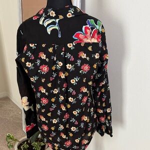 Stylish black button-up shirt with vibrant floral patterns. Perfect for any occasion. Pit to pit 16 inches. Sleeves 22 inch and in 24 inches long.
