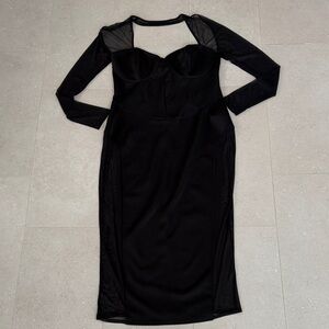 Chic black dress with sheer mesh sleeves. Stylish and modern design. Perfect for evening wear.