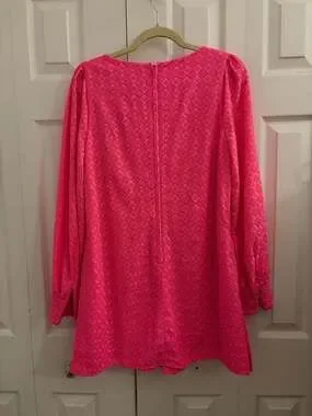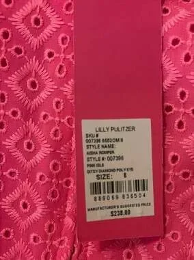 Lilly Pulitzer Aisha Romper in Pink Isle, Women's Size 8. This vibrant pink romper features a beautiful 'Ditsy Diamond' poly eyelet fabric that adds a feminine touch to the classic silhouette. Brand new with original tags attached ($238 MSRP). Perfect for summer parties, tropical vacations, or brunch. Includes a hidden back zipper for a seamless look. No flaws or wear.