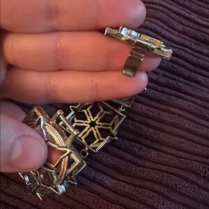 Top on is expandable, other is not. Shown in video! Metal clasp to fasten the one bracelet shown in pic.