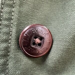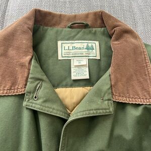 Classic olive green field jacket by L.L. Bean. Features a brown collar and button accents. Ideal for outdoor adventures.