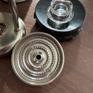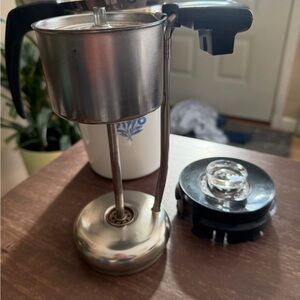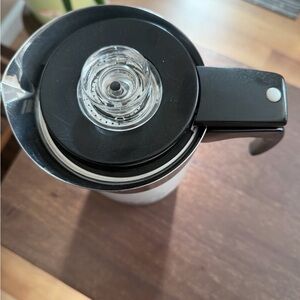 Vintage Corelle blue cornflower coffe pot percolator features a sturdy black handle. Perfect for serving hot beverages. Please look at photos some stains and scratches on the inside of pot and some scratches on bottom of pot.