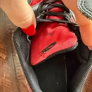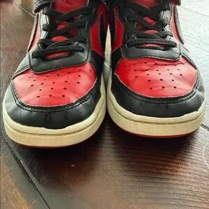 Stylish Nike sneakers for kids. Bold black and red design. Easy to wear with velcro strap. Well loved but life left and would be great for play.