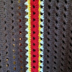 Modern Grandpacore open-hole knit cardigan featuring vertical stripes in red, yellow, and white on chocolate brown.