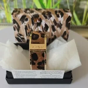 Chic and bold Avon leopard print hinged bangle bracelet featuring brown faux fur panels with a polished gold-tone finish. The signature AVON stamp adds that classic vintage touch.