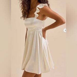 Name/Details: Altar’d State Kristen Satin Mini Dress, tie back, lined, smocked back, short sleeve with charming ruffle details.