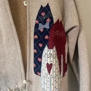 Adorable vintage sweatshirt cardigan-style sweatshirt featuring whimsical cat and paw print appliqué designs in red, navy, and white patchwork fabric. Cozy beige fleece with raw frayed hem for a cute, casual look. Perfect for cat lovers or anyone who loves unique, handmade-style sweaters.