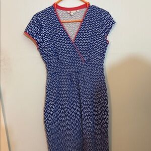 Stylish Boden dress with a wave pattern. Features a blue and white design. Short sleeves with red trim. Perfect for casual outings.