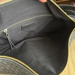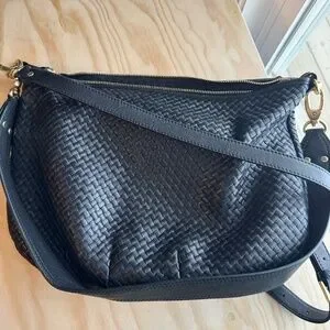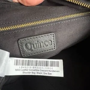 This is the large Italian Leather Convertible Crescent Handwoven Shoulder Bag in black with gold hardware from Quince. It features two detachable straps so it can be worn either over the shoulder or as a crossbody.