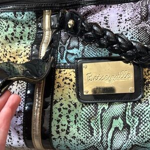 Eye-catching Betsey Johnson bag with a colorful snake pattern. Ideal for travel and style.
