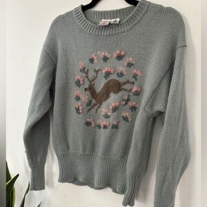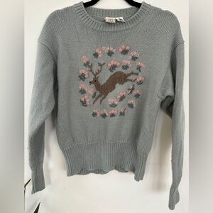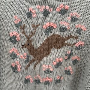Vintage 80’s Wool Gray/Blue Floral Deer Embroidered Cottagecore Sweater Size L