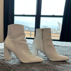 Sleek white ankle booties with a modern design. Features a side zipper for easy wear. Perfect for elevating any outfit.