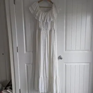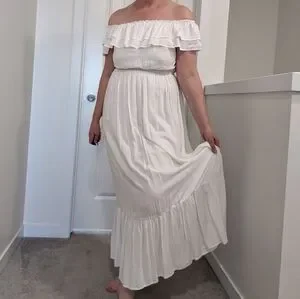 White Off-Shoulder Ruffle Maxi Dress | Elastic Waist & Tiered Hem