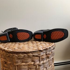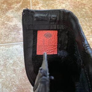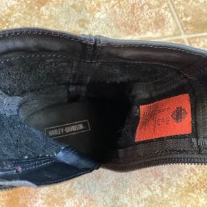 The Genuine Harley-Davidson Women's Leather Riding Boots in size 5 1/2 US are stylish and durable boots designed for motorcycle riding. Made of black leather, these boots feature the iconic Harley-Davidson brand and a USA theme. With a riding boot style, they provide both comfort and protection while on the road. Perfect for female riders looking for a quality and fashionable footwear option. Broken in, soft, slightly worn, tiny scuff on toes (see pic), very comfortable riding shoes, stylish, 1 inch heel, 8 inches height