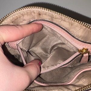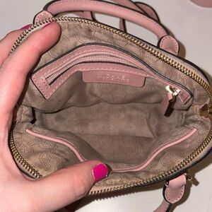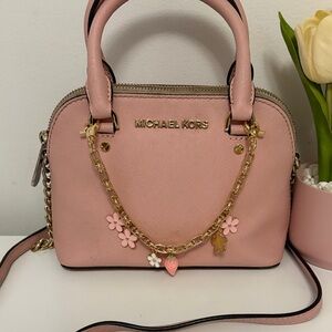 Elegant Michael Kors satchel in blush pink. Features gold chain accents and floral charms. Ideal for a chic look.