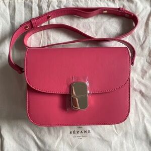 Vibrant fuchsia leather bag with sleek design. Perfect for adding a pop of color. Adjustable strap for comfort.