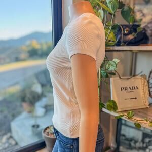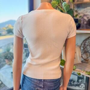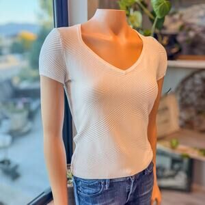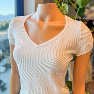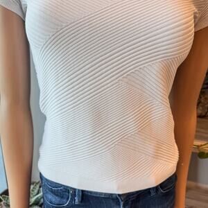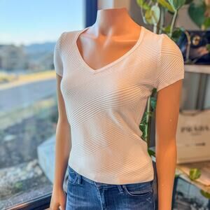 WHBM White Short Sleeve V-Neck Top w/ Diagonal Textured Knit Pattern, Small