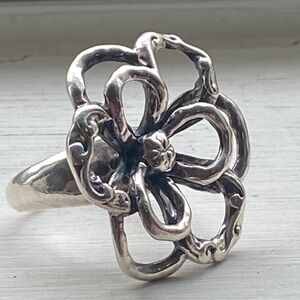 This elegant sterling floral ring has beautiful scroll work and a pretty design . Perfect for any occasion. In very good condition, size 7