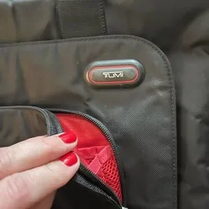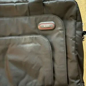 Elegant Tumi laptop bag in black. Ideal for business and travel. Used
