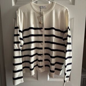 Elegant navy and white stripes. Button-up front. Perfect for layering.