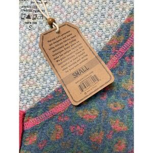 Presenting a brand new with tags (NWT) Natural Life One-Piece Pajama Jumpsuit for women, size Small. This cozy thermal loungewear features a delightful patchwork design with intricate floral patterns in a vibrant multicolor palette, including shades of pink, blue, and green. The top section showcases a smaller, repeating floral motif on a blue/teal background, while the bottom section features a richer, more varied floral design primarily in pinks and purples.