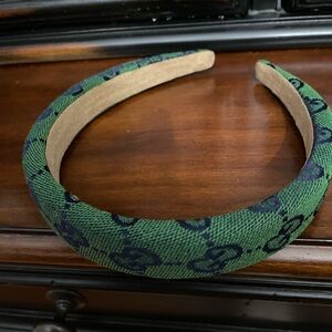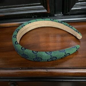 Chic fashion headband with iconic pattern. Green and navy design adds luxury to any look. Also available in dark denim blue