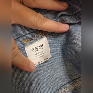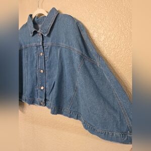 Trendy sky blue denim jacket. Features button closure. Ideal for everyday style.