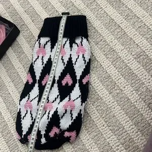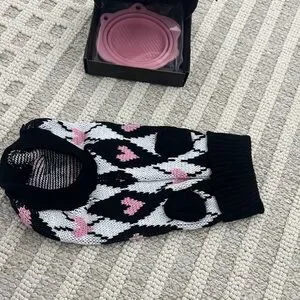 Dog or cat outfit featuring pink heart patterns. Perfect for keeping warm in style travel pet bowl included.