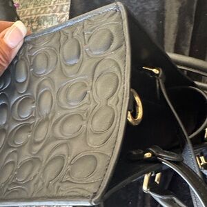 Sophisticated Coach tote with Signature embossed design with gold tone hardware. Sleek black leather. Magnetic closure at top for extra security. Ideal for professional use, traveling a day out shopping! Added off market longer strap. Just a couple small scuffs on bottom and corner that are barely noticeable.