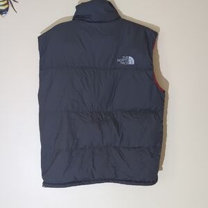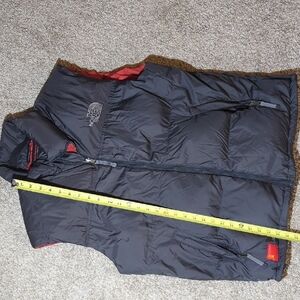 Sleek black vest with red interior. Ideal for layering. Features zip closure and pockets.