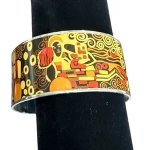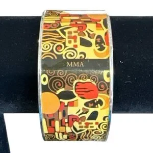 Rich earthy tones of brown, orange, red, black and cream bring to life the artistic tribal symbols and patterns in this Metropolitan Museum of Art (MMA) bangle bracelet. Marked MMA.CN on the inside of the bracelet and MMA on the front.