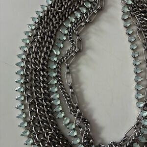 Stunning BaubleBar multi-layer statement necklace featuring layered gunmetal chains accented with delicate mint green teardrop crystals. This bold yet elegant piece adds the perfect touch of edge and sparkle to any outfit—beautiful with everything from a simple tee to an evening look.