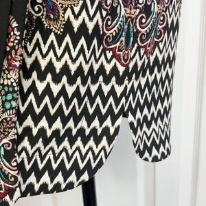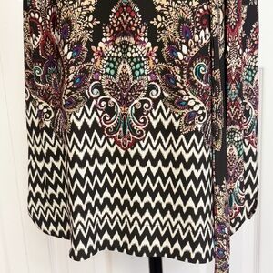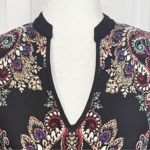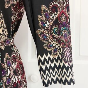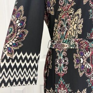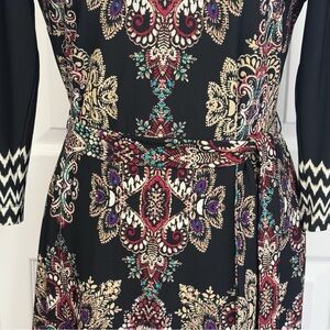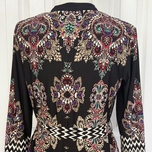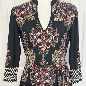NWT DM Collection Boho Black Multi Mixed Print Jeraldeen Jersey Knit Notched Y-Neck 3/4 Sleeve Curved Hem Mini Shift Shirt Dress w/ Waist Tie Belt